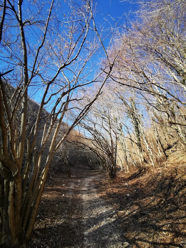 Fare attenzione quando la carrareccia ridiventa a doppio senso in quanto bisogna girare decisamente a destra e prendere il sentiero 171 detto anche del Passo Cattivo che si percorrerà in tutta la sua lunghezza (2,4 km) prima su ampi prati che un tempo erano campi coltivati, importante economia per le famiglie che vivevano a ridosso della montagna e poi su un bosco di orno-ostrieto con orniello, carpine, roverella, aceri e che nella parte finale si trasforma quasi completamente in cerro.